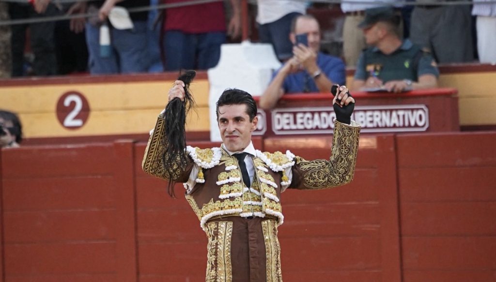 Talavante, que sustituía a Morante de la Puebla (de tabaco y oro): dos orejas y rabo simbólicos; estocada entera arriba (dos orejas).