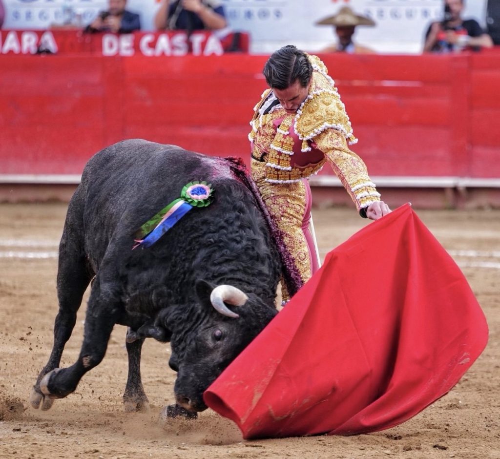 Después de brindar su faena al maestro César Rincón, comenzó su faena pegado a tablas dando muletazos por alto y pegando un trincherazo, el de la firma, y un cambio de mano que hizo vibrar al tendido. Lo fue llevando a los medios con torería y comenzó la sinfonía. El toreo en redondo fue un clamor, se enroscó una y otra vez a “Guantero” y cada pase de pecho era mejor que el anterior. Al natural no fue menor su labor y terminó su faena con la rodilla flexionada toreando en redondo, que para entonces la plaza ya estaba rendida a sus pies. Pinchó una gran faena y terminó dejando una estocada entera desprendidita.